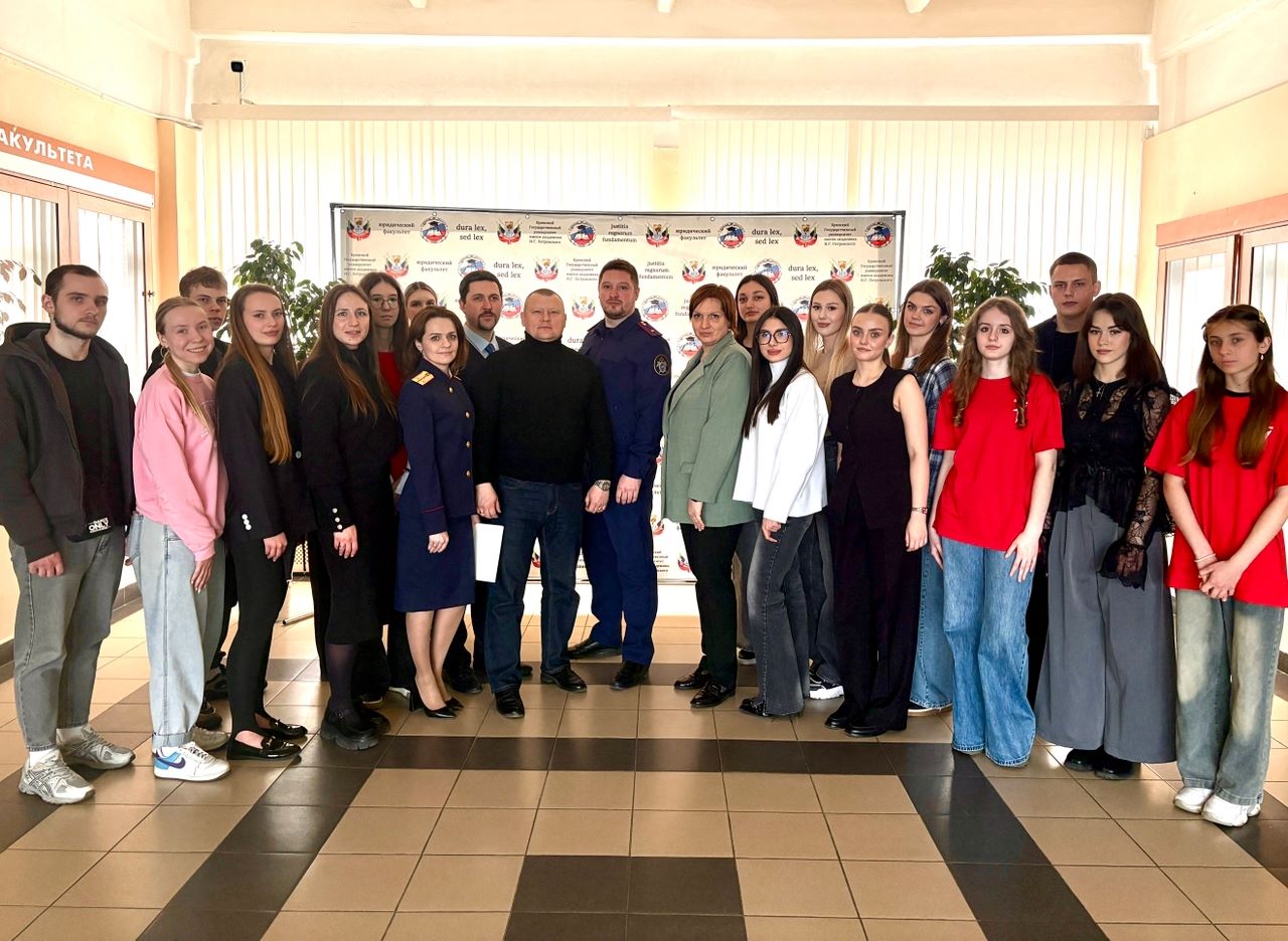 На юридическом факультете прошла встреча студентов с сотрудниками СУ УМВД России по Брянской области. В ней приняли участие врио заместителя начальника УМВД Росси по Брянской области – начальника СУ полковник юстиции С.В. Барашков, врио заместителя начальника СУ УМВД России по Брянской области полковник юстиции Е. М. Синицын, врио заместителя начальника УМВД России по г. Брянску – начальника СУ полковник юстиции Т.Н. Шолохова, начальник отдела по расследованию преступлений, совершенных с использованием ИКТ на территории г. Брянска СУ УМВД России по г. Брянску подполковник юстиции А.А. Сапейкина, начальник отдела следственной части СУ УМВД России по Брянской области подполковник юстиции А.Ю. Гусейнов, декан юридического факультета Е.В. Ткаченко, заместитель декана по учебной и научной работе Я.В. Мальцева, и.о. заведующего кафедрой уголовно-правовых дисциплин, теории и истории государства и права М.В. Стаканова. Мероприятие было организовано в рамках программы профориентации молодёжи и нацелено на повышение правовой грамотности, а также на знакомство обучающихся с профессией сотрудника правоохранительных органов.
