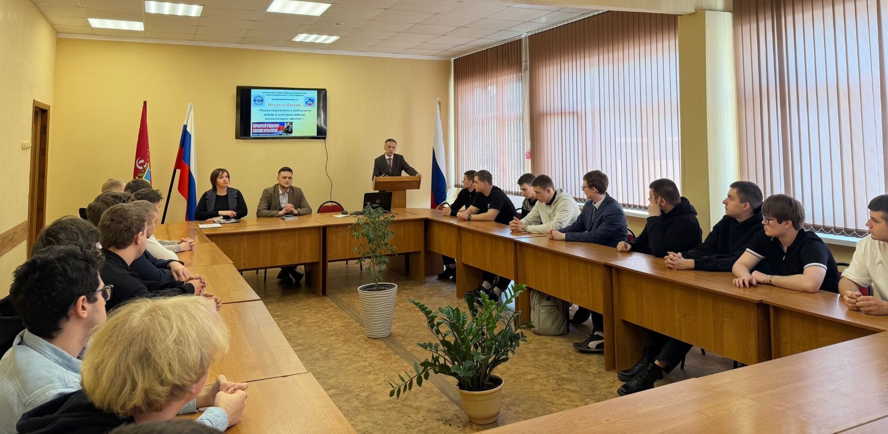 Во время беседы участникам встречи рассказали о недавно созданных войсках беспилотных систем. Студентам был продемонстрирован видеоматериал об особенностях прохождения военной службы по контракту в войсках беспилотных систем Вооруженных Сил Российской Федерации, о том, чему их научат при подготовке операторов БПЛА. Спикеры подробно осветили перспективы профессионального развития в современных военных структурах, требования и условия поступления на контрактную службу.
