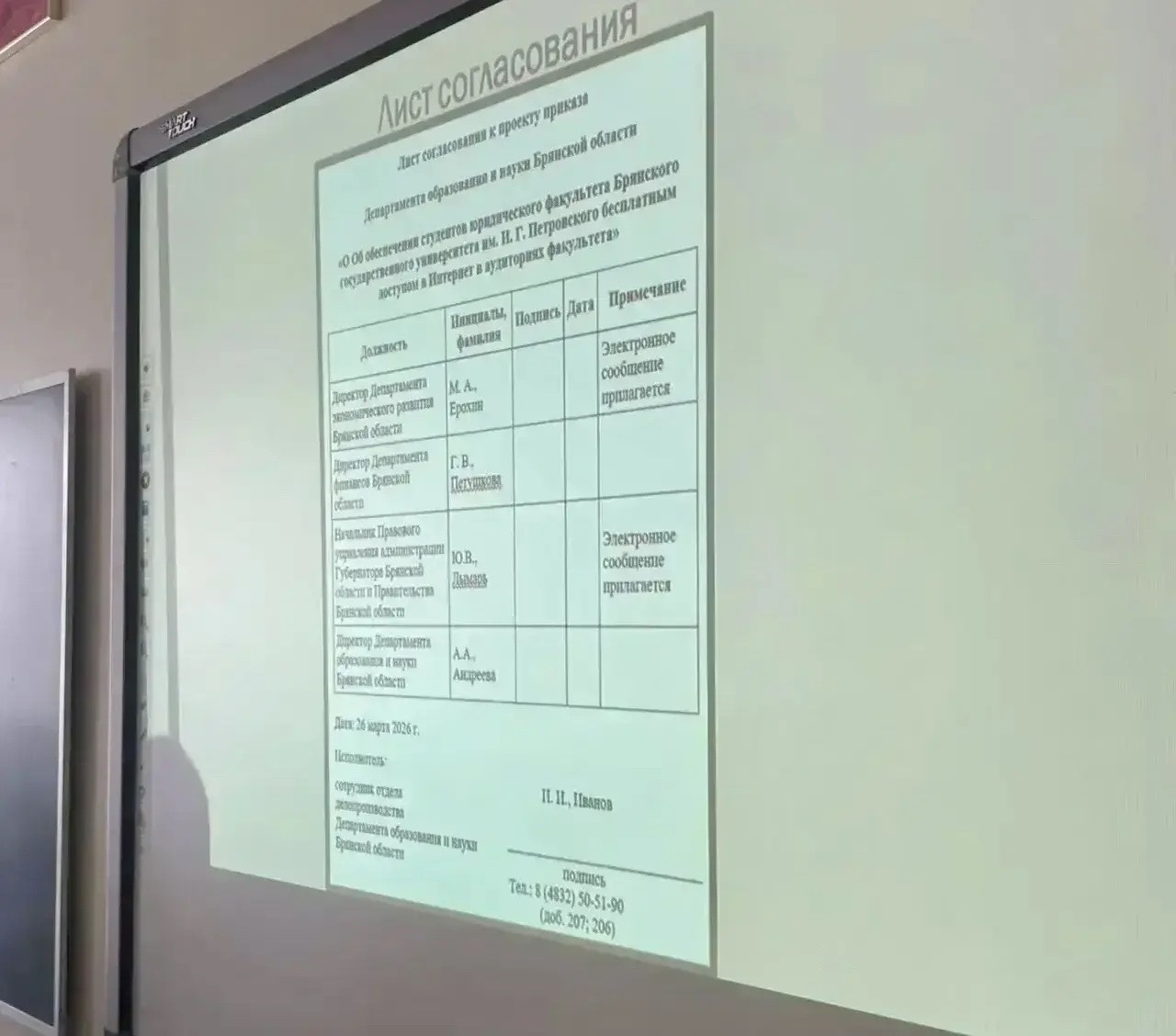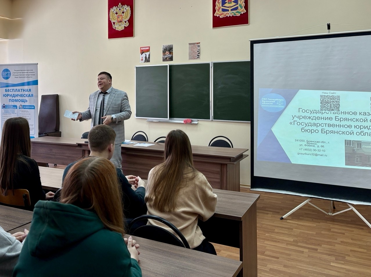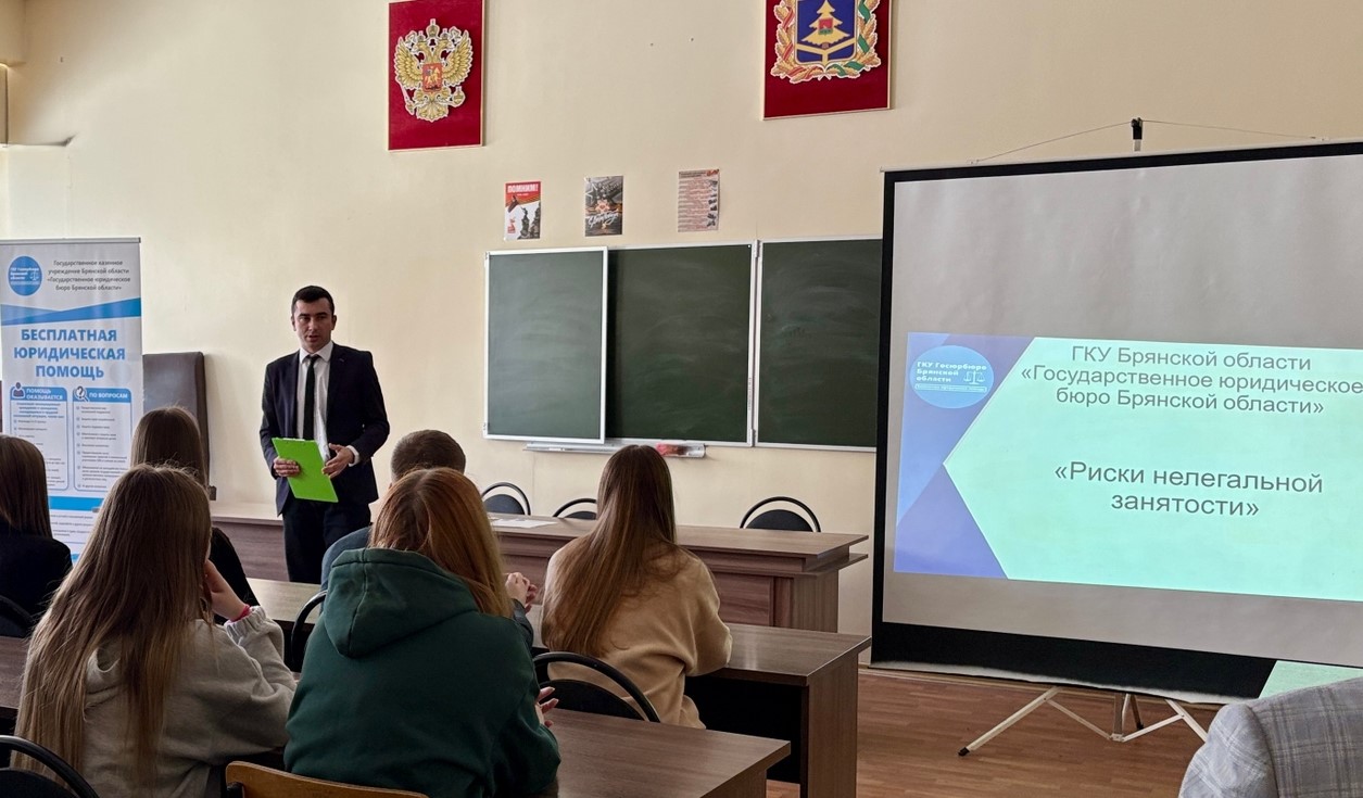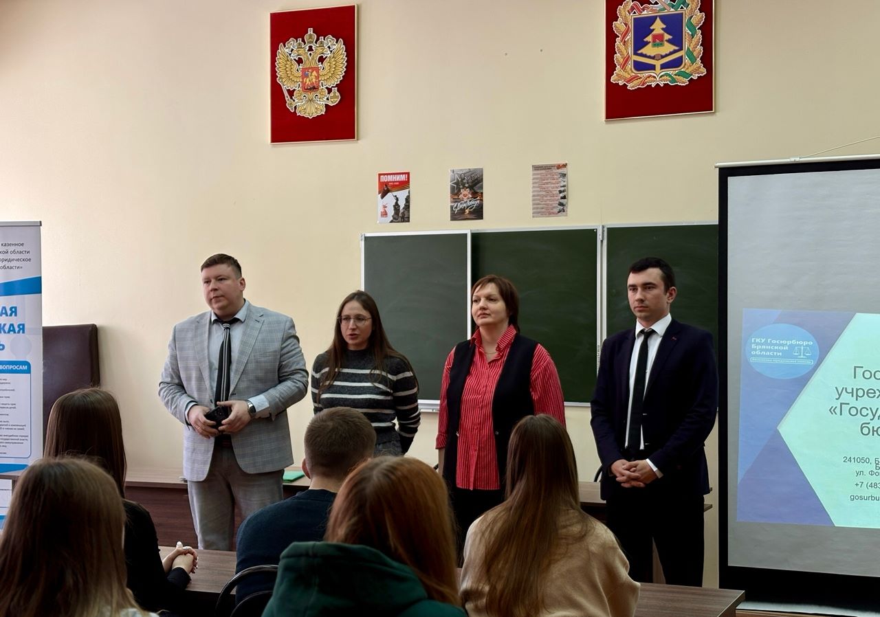Правовое просвещение и профориентационная работа с молодежью остается одним из приоритетных направлений работы Брянского государственного университета и юридического факультета. 20 марта 2026 года в рамках этой деятельности деканом юридического факультета Ткаченко Е.В. и заместителем декана по учебной и научной работе Мальцевой Я.В. была организована встреча студентов 2 и 4 курса с сотрудниками ГКУ «Госюрбюро Брянской области», которые рассказали о способах предотвращения нарушений трудового законодательства.
