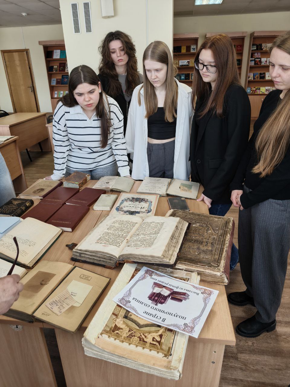 Помимо этой экспозиции студенты с большим интересом посетили тематические выставки в читальном зале. Среди книг – подлинник уникального издания Московского Печатного двора «МИНЕЯ СЛУЖЕБНАЯ», за декабрь 1636 года. Обложка книги сделана из дерева 1 см толщиной, обтянутого кожей и первоначально имела два металлических замка, позже остался один.