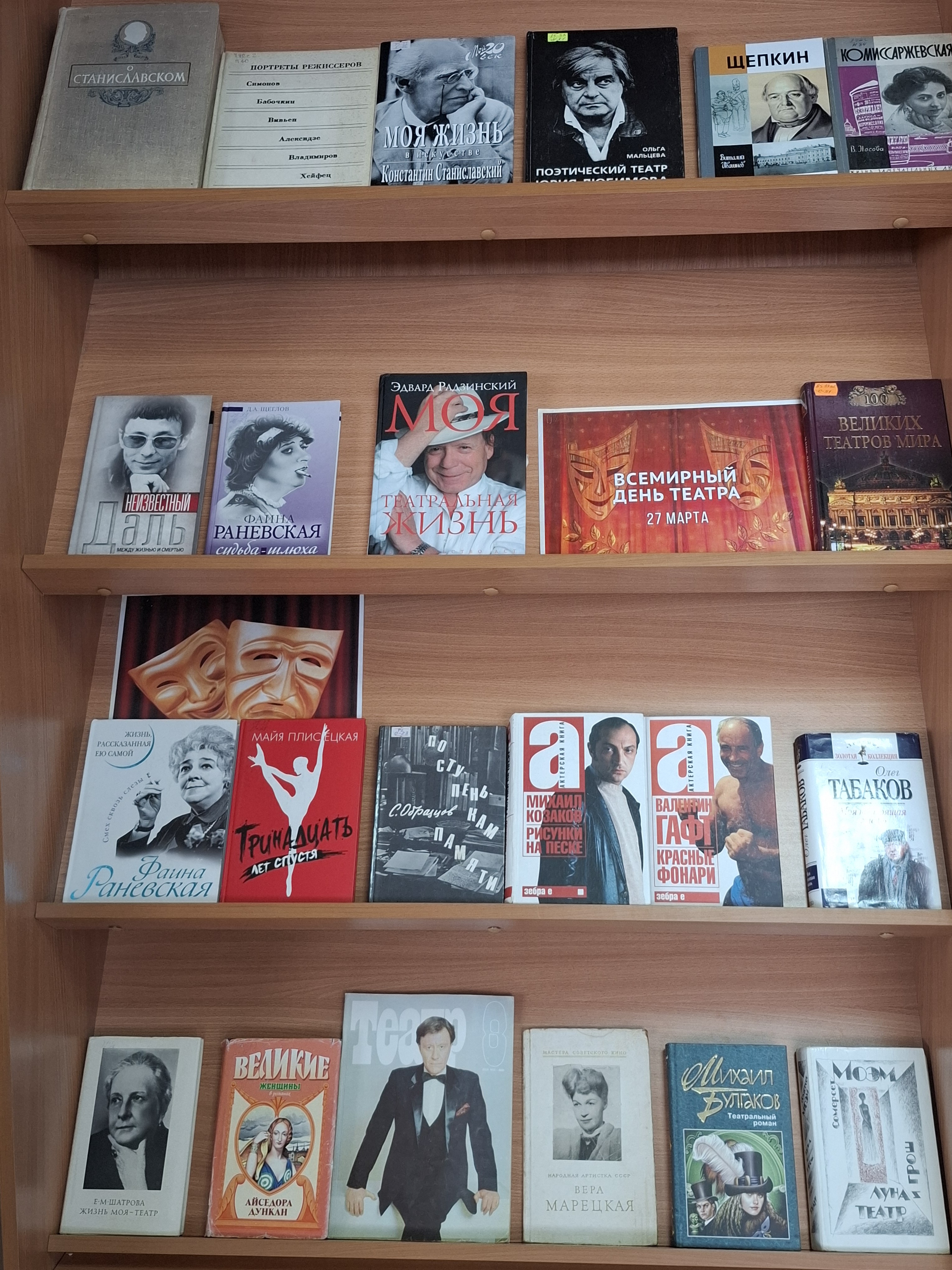В читальном зале библиотеки оформлена книжная выставка «Театр в лицах: роли и судьбы».